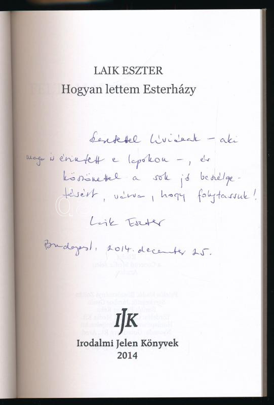 Laik Eszter: Hogyan lettem Esterházy. A szerző, Laik Eszter (1973-) író, újságíró által Mohás Lívia (1928-2024) pszichológus, József Attila-díjas írónak DEDIKÁLT példány. hn., 2014, Irodalmi Jelen Könyvek. Kiadói papírkötés.