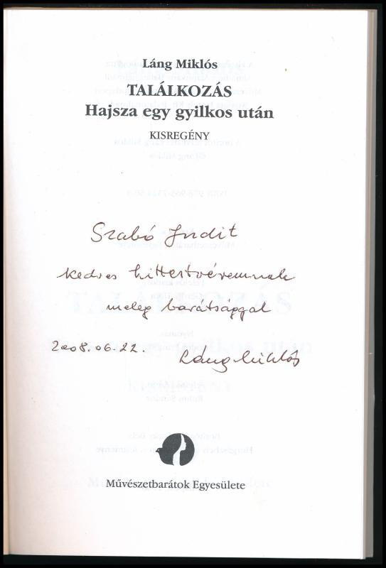 Láng Miklós: Találkozás. Hajsza egy gyilkos után. (Dedikált!) Bp., 2008, Művészetbarátok Egyesülete. Kiadói papírkötés. A szerző által dedikált példány.