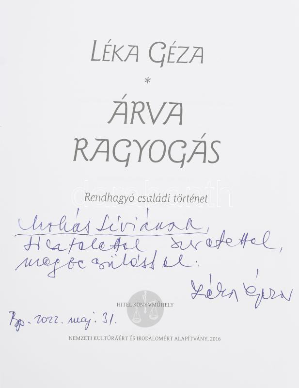 Léka Géza: Árva ragyogás. Rendhagyó családi történet. A szerző, Léka Géza (1957-) író, költő által Mohás Lívia (1928-2024) pszichológus, József Attila-díjas (2002) írónak DEDIKÁLT példány! Bp., 2016, Nemzeti Kultúráért és Irodalomért Alapítvány. Kiadói kartonált papírkötés.