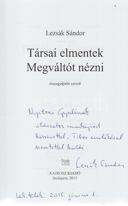 Dedikált: ,,Nyitrai Gyulának áldozatos munkájáért köszönettel, Tibor emlékével szeretettel küldi: Lezsák Sándor. Lakitelek, 2015, június 1".