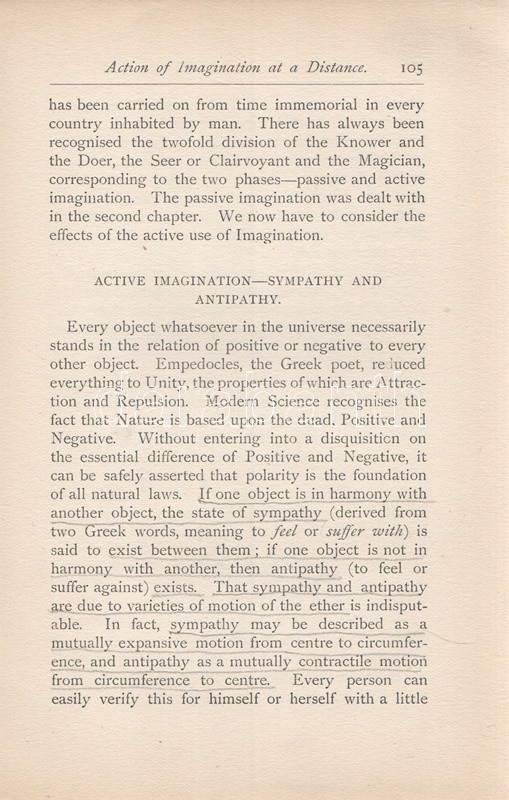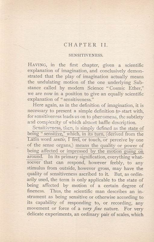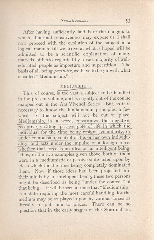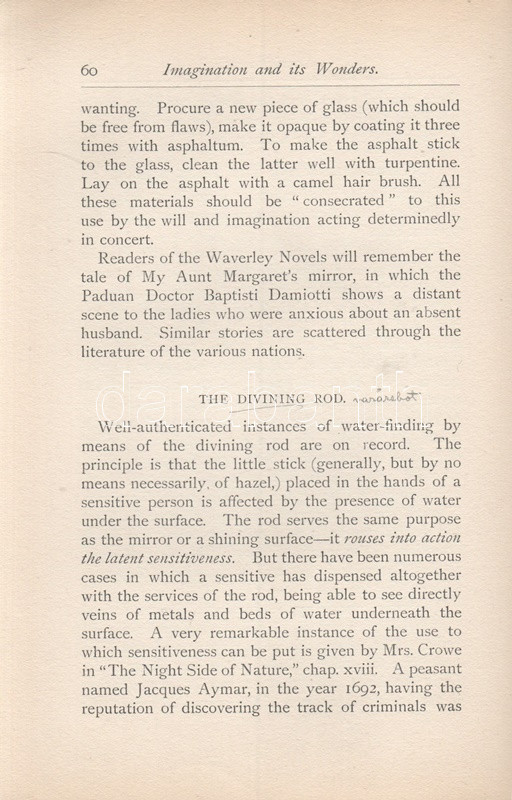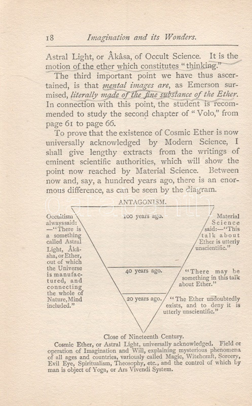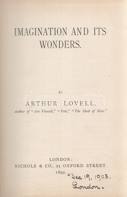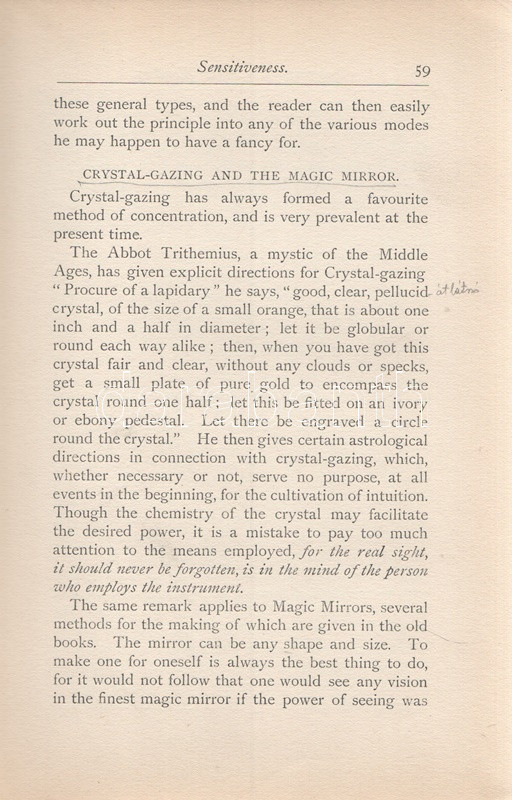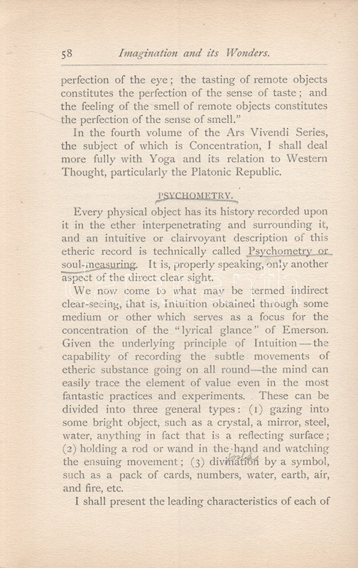 Arthur Lovell természetgyógyász és ezoterikus szerző értekezése az érzékeken túli érzékelés hatalmáról és eljárásairól, a varázsvesszőtől a kártyajóslásig, a telepátiától a pszichometriáig, a talizmán- és amuletthasználatig. Az oldalszámozáson belül néhány ezoterikus ábrával kísért értekezés egy fejezete a nyugati okkult hagyomány egyes képviselőit és irányzatait méltatja, Paracelsustól a modern spiritisztákig. A címoldalon a könyv megszerzésének, az utolsó szövegoldalon a kötetolvasás befejezésének kézi dátumozása. Néhány oldalon magyar nyelvű jegyzetek, aláhúzások, szövegkiemelések.