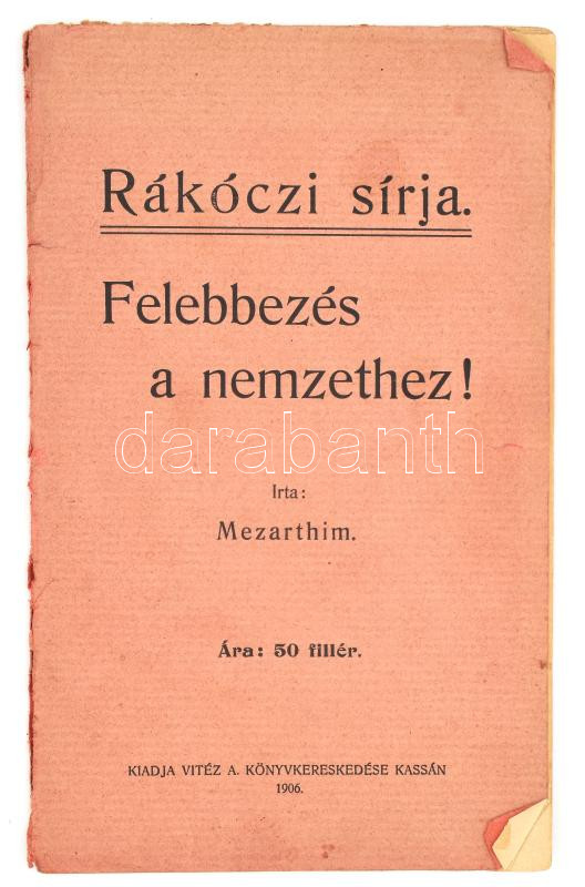 Mezarthim: Rákóczi sírja. Felebbezés a nemzethez. Kassa, 1906. Vitéz A... https://www.darabanth.com/hu/472-Gyorsarveres/472.0/Konyvek/Konyvek-Egyeb-ritkasagok~500036/Mezarthim-Rakoczi-sirja-Felebbezes-a-nemzethez-Kassa-1906-Vitez-A-konyvkereskedese-21p~II3201287