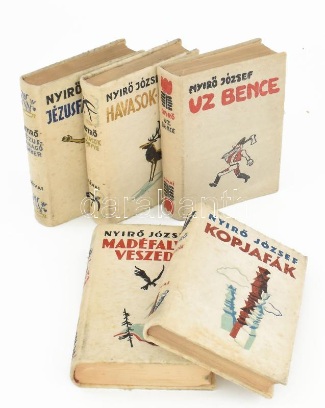 Leírás: Nyirő József 5 kötete: Uz Bence.; Kopjafák.; Madéfalvi veszedelem.; Havasok könyve.; Jézusfaragó ember. Bp., 1934-1939, Révai. Kiadói halina-kötés, változó állapotban, kissé foltos borítókkal, tulajdonosi bélyegzőkkel.