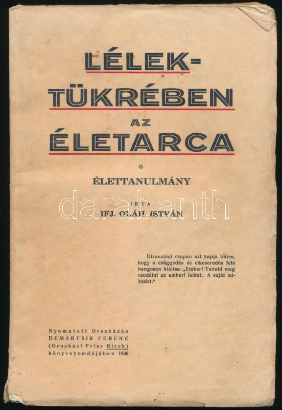 Oláh István, ifj.: Lélektükrében az életarca. (Dedikált!) Orosháza, 1936, Demartsik Ferenc-ny., 138+(2) p. Kiadói papírkötés, kissé viseltes, sérült, foltos borítóval. A szerző által dedikált példány.