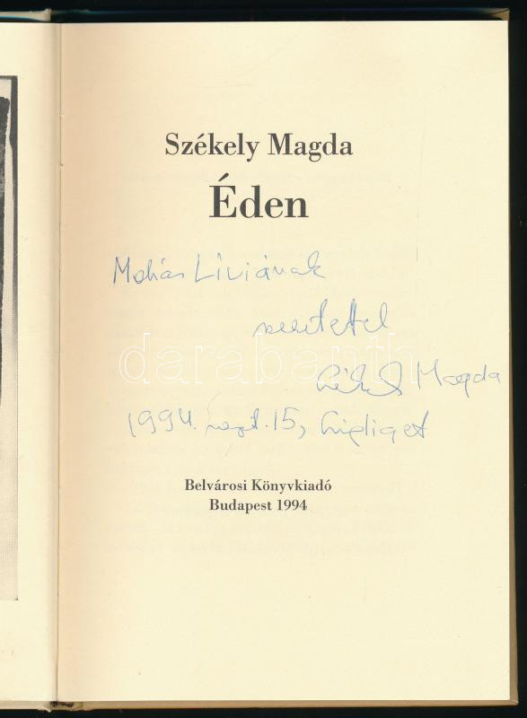 Leírás: Székely Magda: Éden. A szerző, Székely Magda (1936-2007) Kossuth-díjas költő, műfordító által Mohás Lívia (1928-2024) pszichológus, József Attila-díjas írónak DEDIKÁLT példány. Bp., 1994, Belvárosi Könyvkiadó. Kiadói kartonált papírkötés.