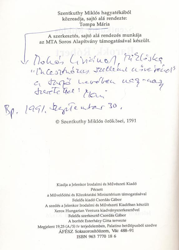 Szentkuthy Miklós: Barokk Róbert. Közreadja, sajtó alá rendezte: Tompa Mária. A szerkesztő, a Szentkuthy-hagyaték kezelője, Tompa Mária (1936- ) által Mohás Lívia (1928-2024) pszichológus, József Attila-díjas írónak DEDIKÁLT példány, dátumozott példány. Pécs, 1991,Jelenkor. Első kiadás. Kiadói papírkötés, benne Mohás Lívia ceruzás aláhúzásaival és jegyzeteivel.