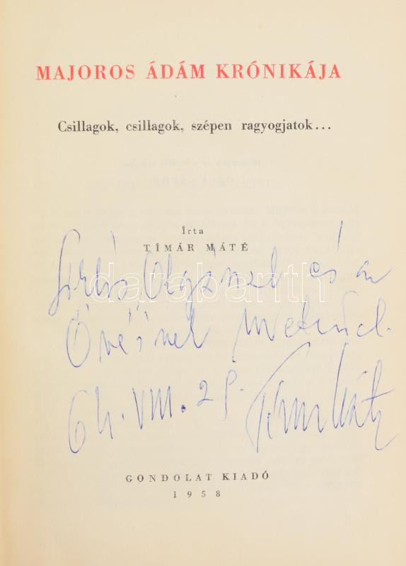 Tímár Máté: Majoros Ádám krónikája. Csillagok, csillagok, szépen ragyogjatok... A szerző, Tímár Máté (1922-1999) József Attila-díjas író által DEDIKÁLT példány! Magyar Világ. Bp., 1958, Gondolat. Gacs Gábor illusztrációival. [Majoros Ádám krónikája. I. rész. A II. rész: "Hajnal hasad, fényes csillag ragyog... " 1960-ban jelenik meg.] Kiadói kissé kopott félvászon-kötés.