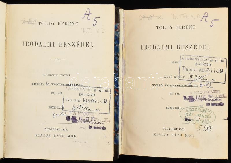 Toldy Ferenc irodalmi beszédei. I-II. köt. I. kötet: Gyász- és emlékbeszédek. 1833-1855. II. köt.: Emlék és vegyes beszédek.1834-1872. Bp., 1878, Ráth Mór, XI+430 p. 2. kiadás. Korabeli aranyozott gerincű félbőr-kötés, régi intézményi bélyegzésekkel.