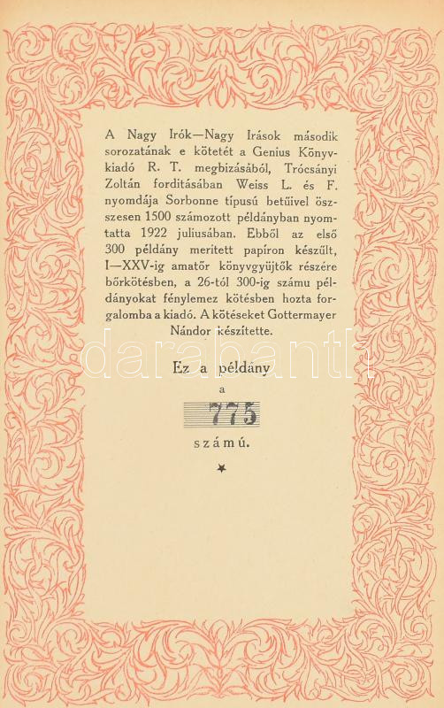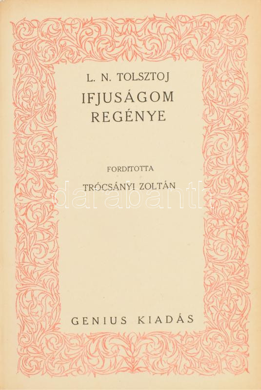 Tolsztoj, [Lev Nyikolajevics]: Ifjúságom regénye. Ford.: Trócsányi Zoltán. Nagy Írók - Nagy Írások. Második sorozat IV. köt. Bp., (1922), Genius, XXIV+437 p. Korabeli, átkötött félvászon-kötésben, jó állapotban. Számozott (775./1500) példány.