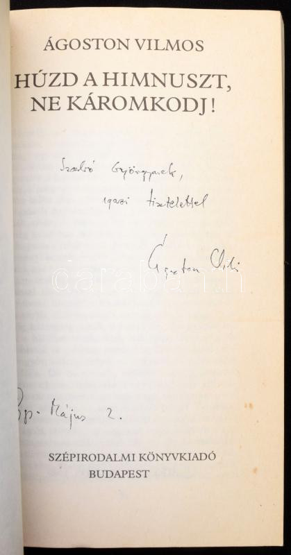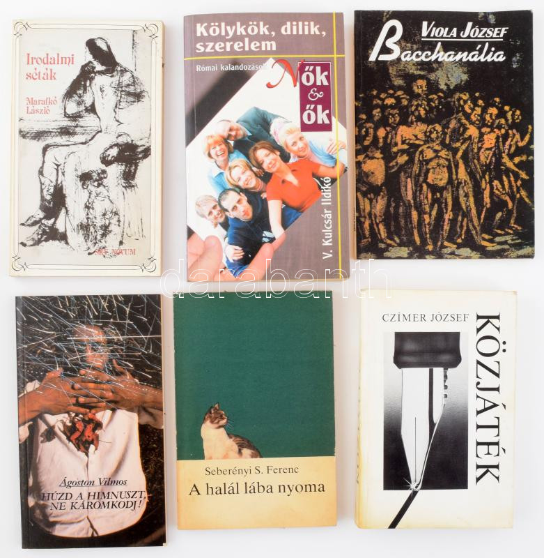 Vegyes dedikált könyvtétel, 6 db: Seberényi S. Ferenc: A halál lába nyoma, V. Kulcsár Ildikó: Kölykök, dilik, szerelem, Marafkó László: Irodalmi séták, Ágoston Vilmos: Húzd a himnuszt, ne káromkodj, Czímer József: Közjáték, Viola József: Bachanália.