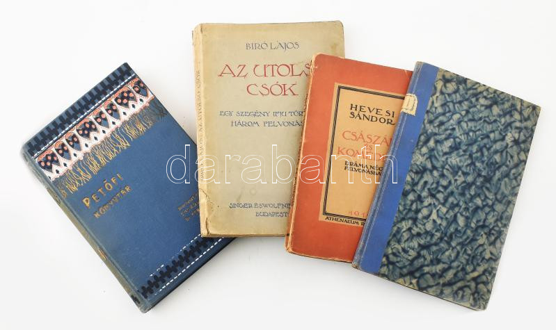 Vegyes könyvtétel, 4 db: Biró Lajos: Az utolsó csók. Egy szegény ifjú története három felvonásban. Bp., 1914, Singer és Wolfner. Első kiadás. Kiadói papírkötés, szakadt borítóval, kissé sérült gerinccel.; Hevesi Sándor: Császár és komédiás. Dráma négy felvonásban. Bp., 1919, Athenaeum. Első kiadás. Kiadói papírkötés, sérült borítóval és gerinccel. Darvas József: Szakadék. Dráma három felvonásban. Bp.,[1943], Magyar Élet. Első kiadás. Átkötött félvászon-kötés, kissé kopott borítóval.; Lenkei Henrik: Petőfi és a természet. Baróti Lajos: Petőfi a ponyván és a népirodalomban. Péterfy Tamás: Petőfi-regék. Mühlbeck Károly rajzaival. Petőfi-Könyvtár XXI-XII. füzet. Bp., 1910, Kunossy, Szilágyi és Társa.