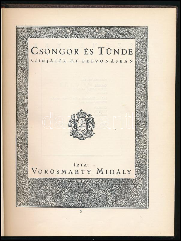 Vörösmarty Mihály: Csongor és Tünde. Megjelent Vörösmarty születésének 100 esztendős évfordulója alkalmából. Bp., 1930, Könyvbarátok Szövetsége, (Kir. M. Egyetemi Nyomda), 100 p.+ 5 t. Kádár Lívia lapszámozáson belüli, öt egészoldalas rajzával. Bibliofil, keretdíszes lapokkal, külön erre a célra készült vízjegyes papíron (Diósgyőri Papírgyár.) Kiadói aranyozott egészvászon kötés, kissé kopott gerinccel és borítóval, régi tollas névbejegyzéssel, ceruzás ajándékozási sorokkal, volt könyvtári példány.