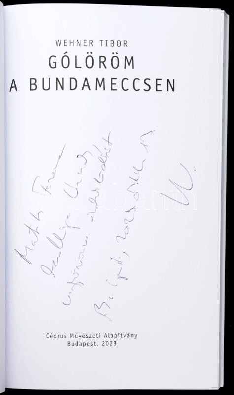 Wehner Tibor: Gólöröm a bundameccsen. A szerző, Wehner Tibor (1948-) művészettörténész, író által Matits Ferenc művészettörténész, művészeti író, egyetemi tanár részére DEDIKÁLT példány! Bp., 2023, Cédrus Művészeti Alapítvány. 148 p. Kiadói papírkötés.