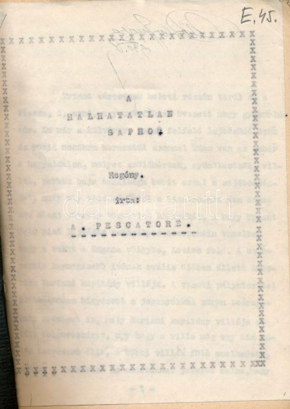 cca 1930 A. Pescatore: A halhatatlan Szapho. Regény. hn., én., nyn., 95+1 p.+3 (erotikus képtáblák) t. Erotikus, pornográf kiadvány. Fűzött papírkötés, 1930-as névbejegyzéssel.