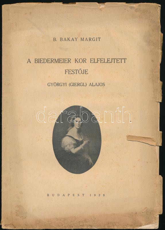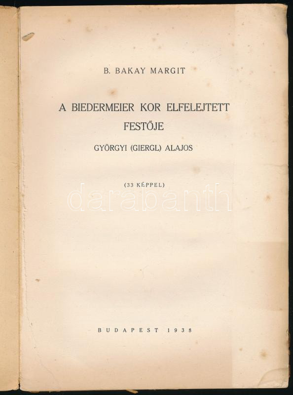 B. Bakay Margit: A biedermeier kor elfelejtett festője Györgyi (Giergl) Alajos. Bp., 1938, (Sárkány ny.) 94 p. + 32 t. Kiadói papírkötés, a borító a széleken sérült, foltos borítóval, ceruzás bejelölésekkel.