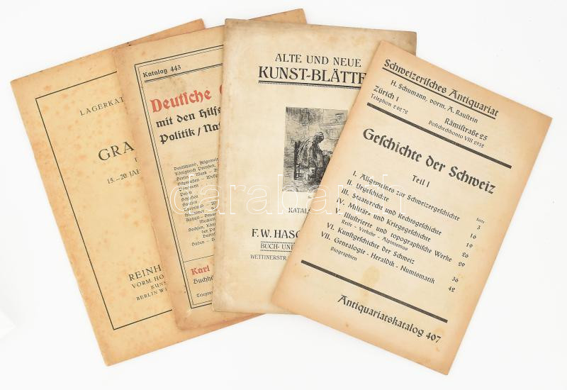 cca 1916 Vegyes aukciós katalógus tétel, 4 db. Karl W. Hiersemann Katalog 443, Reinhold Pippel Lagerkatalog XIX., F. W. Haschke Katalog Nr. 10., Schweizerisches Antiquariat. Antiquariatskatalog 407. Papírkötés, kissé foltos borítókkal.