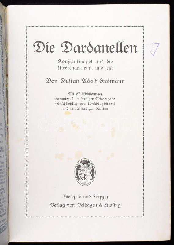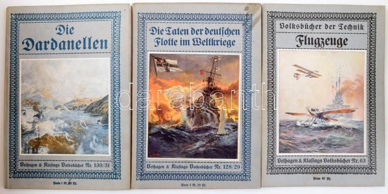 3 db német haditengerészettel, ill. repüléssel kapcsolatos füzet: Flugzeuge.; Die Taten der deutschen Flotte im Weltkriege.; Die Dardanellen. Velhagen & Klasings Volksbücher Nr. 63., 128/29., 130/31. Bielefeld-Leizpig, é.n. (cca 1910-1915), Velhagen & Klasing. Fekete-fehér és színes képekkel illusztrálva. Német nyelven. Kiadói papírkötés, vegyes állapotban.