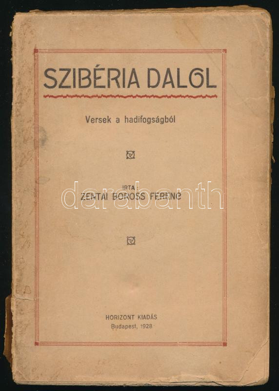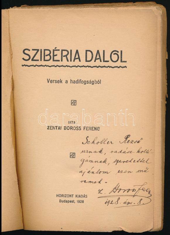Boross Ferenc, zentai: Szibéria dalol. Versek a hadifogságból. (Dedikált!) Bp., 1928, Horizont, 172+(4) p. Kiadói papírkötés, sérült borítóval és gerinccel, helyenként kissé sérült lapszélekkel, a 99-126. oldalak kijárnak. A szerző által Scholler Rezső (1882-?) festőművész részére dedikált példány: ,,Scholler Rezső urnak, vadász-kollégámnak, szeretettel ajánlom ezen művemet."