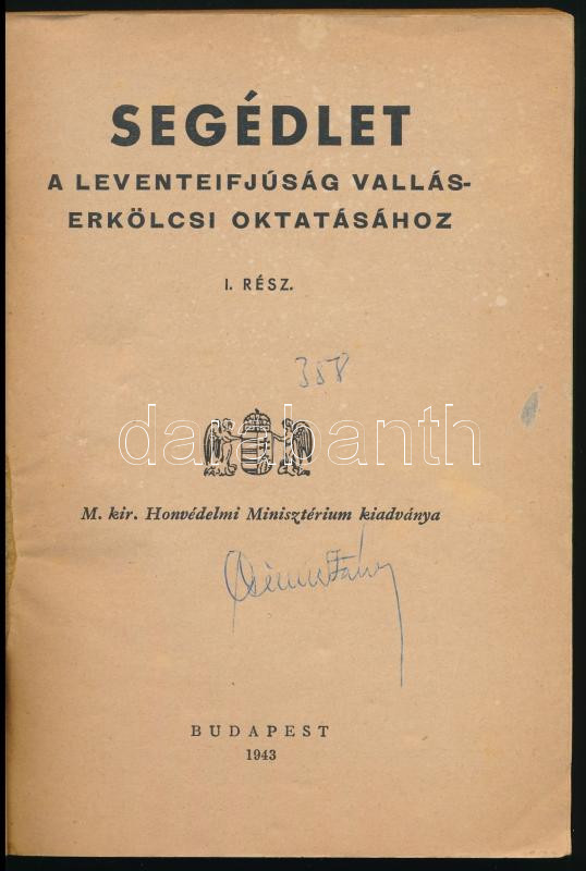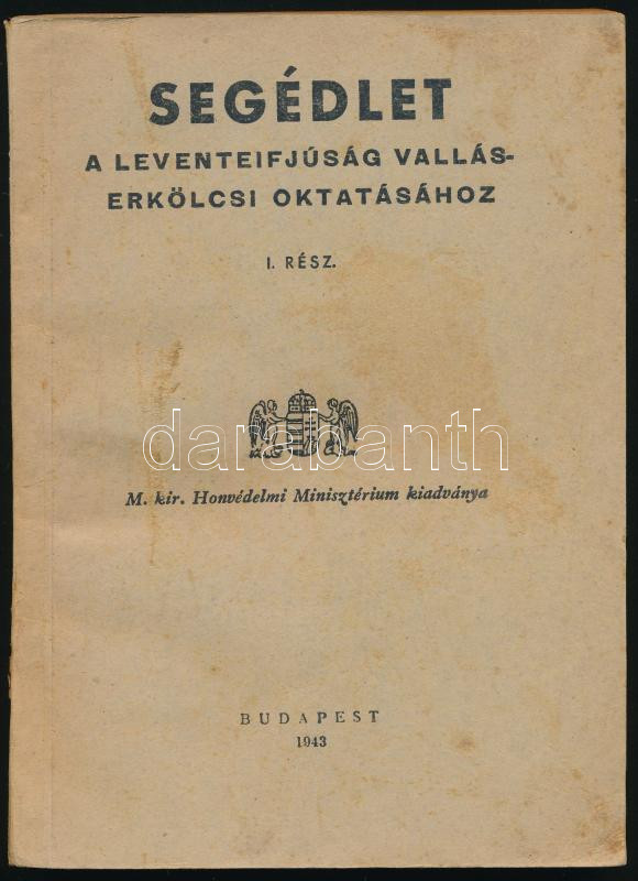 Segédlet a leventeifjúság vallás-erkölcsi oktatásához. I. rész. (Unicus!) M. Kir. Honvédelmi Minisztérium kiadványa. Bp., 1943, (Athenaeum-ny.), 188 p. Kiadói papírkötés, kissé sérült, foltos borítóval, néhány kissé foltos lappal, a címlapon tulajdonosi névbejegyzéssel. A könyv három korcsoport szerint, havi bontásban rendszerezi az anyagot. A harmadik, legidősebb korcsoportban fejti ki a "Zsidó fajjal való egészségtelen kapcsolatok"-at. A kötet - a leventeirodalom nagy részével ellentétben - nem szerepel a tiltólistán.