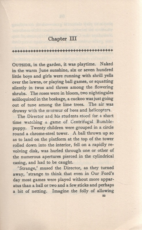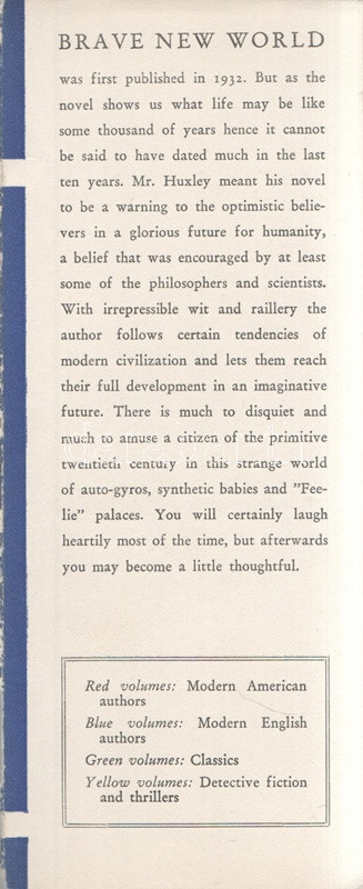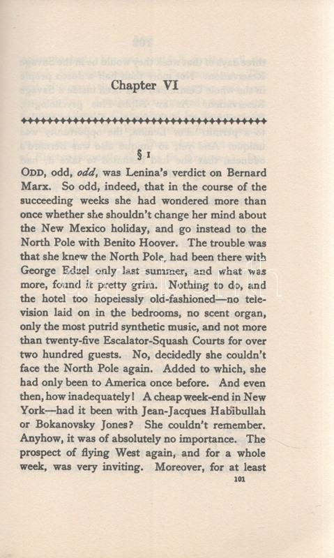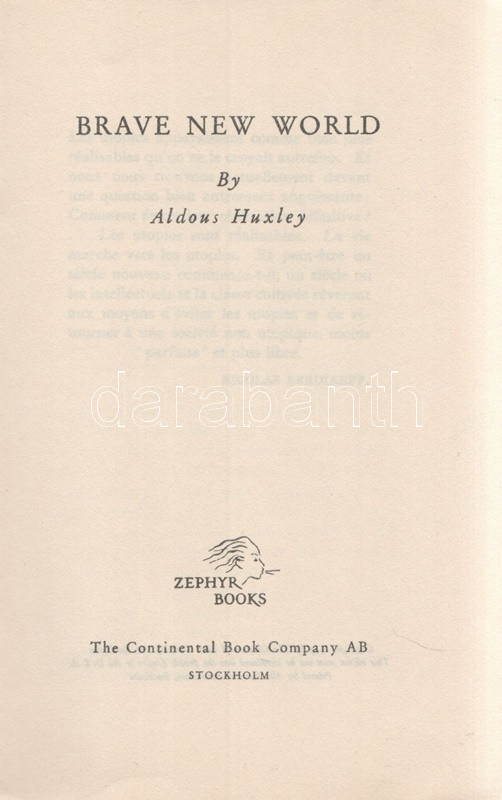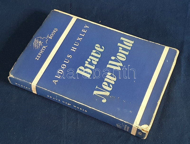 Huxley, Aldous: Brave New World. [A Novel.] Stockholm, (1943). The Continental Book Company AB. (Printed by Alb. Bonniers Boktryckeri). [4] + 306 p. Aldous Huxley (1894-1963) brit író tudományos-fantasztikus regénye - egyben az egyik legkiválóbb disztópia, a műfaj megkerülhetetlen alkotása - eredeti nyelven először 1932-ben jelent meg. A befutott író regénye 1932-ban jelent meg svédül, ,,Du sköna nya värld" címmel, Greta Tiselius fordításában, magyar változata 1934-ben látott napvilágot, ,,Szép új világ" címen, Szinnai Tivadar átültetésében. Angol nyelvű svédországi kiadásunk a svéd Continental Book Company angol és amerikai szerzőket eredeti nyelven kiadó sorozatában jelent meg. (Zephyr Books. A Library of British and American Authors. Vol. 15.) Fűzve, feliratozott kiadói borítóban, színes, illusztrált, enyhén sérült kiadói védőborítóban. Jó példány.