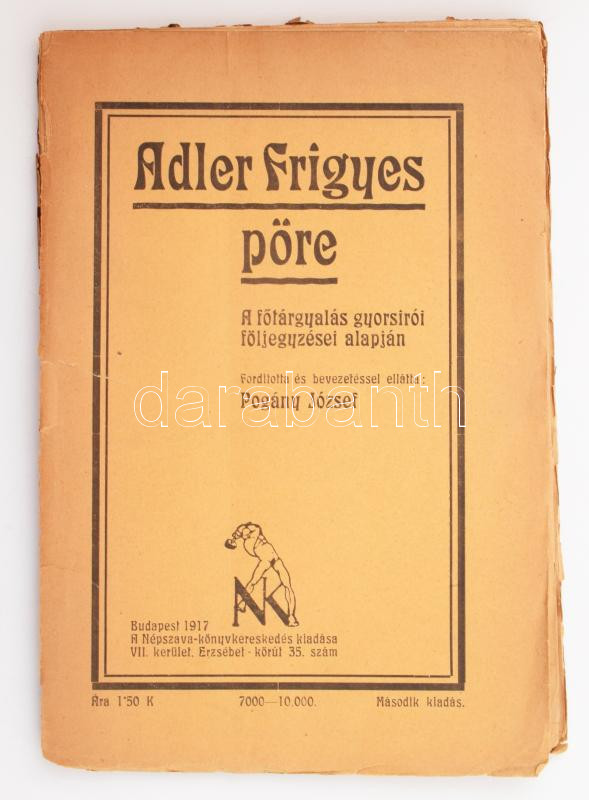 Adler frigyes pöre. A főtárgyalás gyorsírói följegyzései alapján fordította és bevezetést írta - -. Bp., 1917, Népszava, (Világosság-ny.), 110+1 p. Második kiadás. Kiadói papírkötés, a borító és a címlap leszakadt, sérült gerinccel.