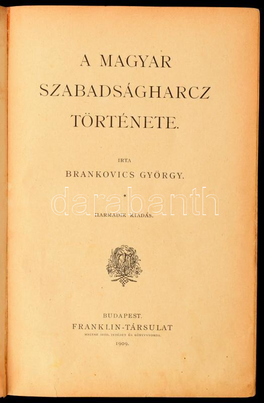 Brankovics György: A magyar szabadságharcz története. Bp., 1909, Franklin, 416 p.+3 t. Harmadik kiadás. Szövegközti fekete-fehér illusztrációkkal. Kiadói illusztrált félvászon-kötésben, kopott borítóval, javított gerinccel.