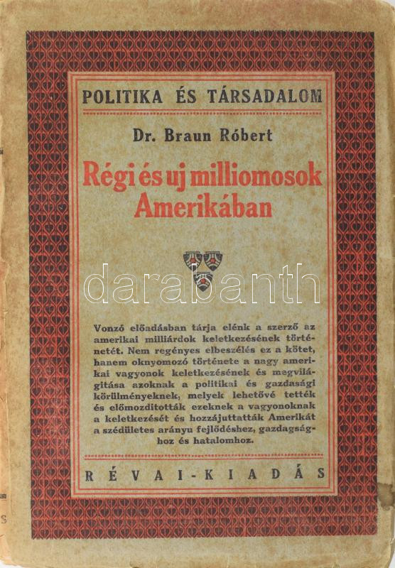 Braun Róbert: Régi és uj milliomosok Amerikában. Politika és Társadalom 2. Bp., én., Révai. Kiadói papírkötés, szakadt borítóval, szétvált kötéssel. Felvágatlan lapokkal.