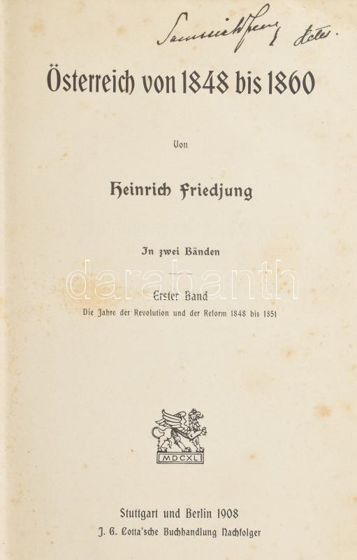 Friedjung, Heinrich: Österreich von 1848 bis 1860. In zwei Bänden. Erster Band: Die Jahre der Revolution und der Reform 1848 bis 1851. (Zweite Auflage.) Zweiter Band: Erste Abteilung. 1 kötet