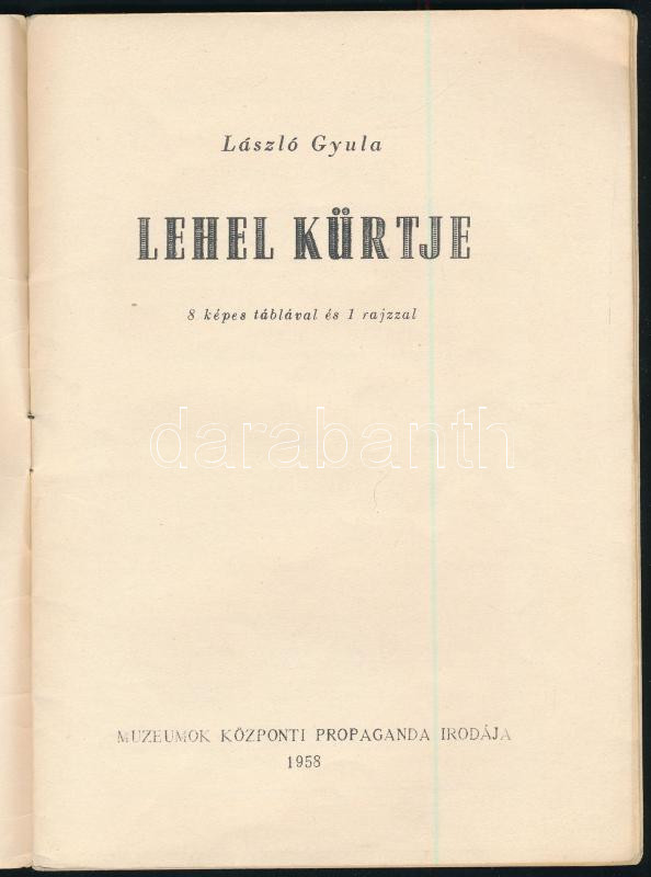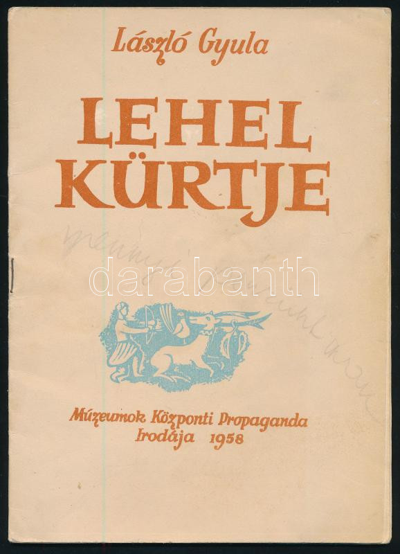 László Gyula: Lehel kürtje. Bp.,1958, Múzeumok Központi Propaganda Irodája, 17 p.+ 6 t. +1 (kihajtható tábla) t. Egészoldalas és egy kihajtható fekete-fehér illusztrációval. Második kiadás. Kiadói papírkötésben, az elülső borítón bejegyzéssel. Megjelent 2000 példányban.