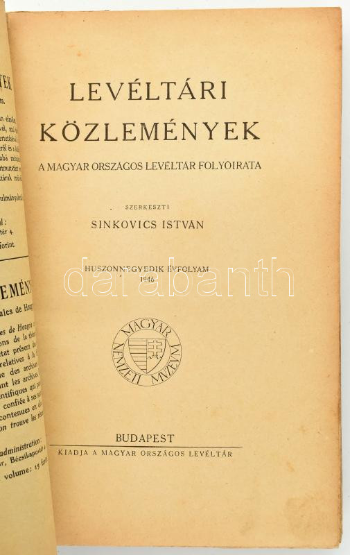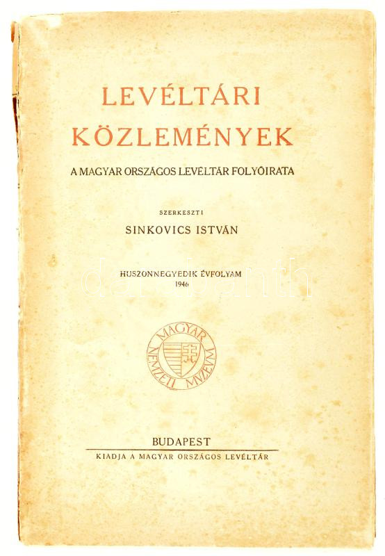 Levéltári Közlemények. A Magyar Országos Levéltár folyóirata.21. évf, Szerk. Sinkovics István. Bp., 1946. Magyar Országos Levéltár.. Kiadói papírborítóban, felvágatlan