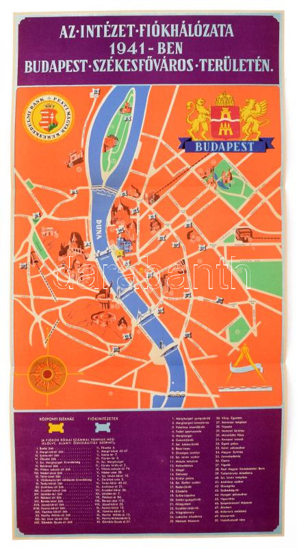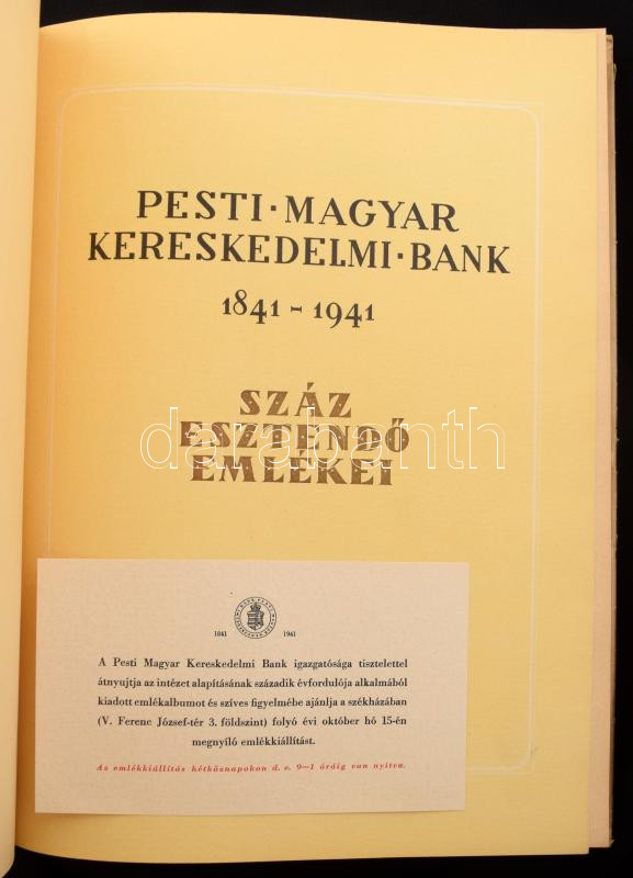 Pesti Magyar Kereskedelmi Bank 1841-1941. Száz esztendő emlékei. Dr. Lamotte Károly bevezetőjével. Bp., 1941, Pesti Magyar Kereskedelmi Bank. 2 db térkép-melléklettel: Magyarország 1941 július havában - Az intézet vidéki fiók és leányintézeteinek hálózata, 41,5x29 cm; Az intézet fiókhálózata 1941-ben Budapest Székesfőváros területén, 56x29 cm. Kiadói papírkötés, kissé sérült borítóval, belül jó állapotban, sérült hártyapapír védőborítóban. A térkép-mellékletek hibátlan állapotban megvannak!