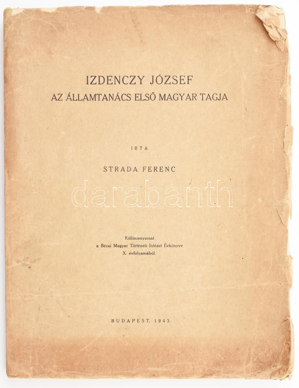 Strada Ferenc: Izdenczy József az államtanács első magyar tagja. [Bp.], 1943, (Sárkány-ny.), 98 p. Különlenyomat. Kiadói papírkötés, foltos, sérült borítóval, két lapszélen szakadásokkal, de belül ezt leszámítva jó állapotban.