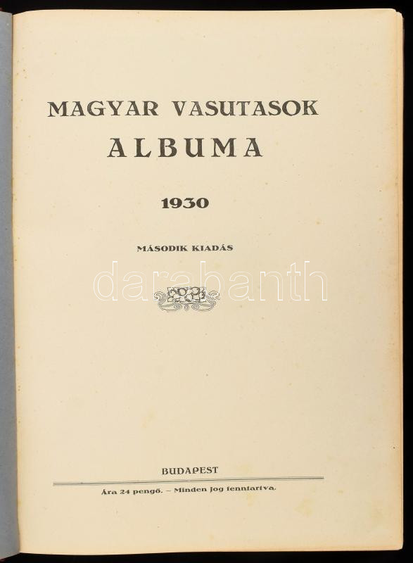 Magyar vasutasok albuma. 1930. Szerk.: Vass István. Bp., 1930, Magyar Vasutasok Albuma-Vállalat (Hauptmann Béla-ny.), 316+2+4 p. Második kiadás. Számos szövegközi fekete-fehér fotóval, könyvdíszekkel, korabeli reklámokkal. Fekete-fehér képanyaggal illusztrált. Kiadói dúsan aranyozott félvászon-kötés, kis kopásnyomokkal, javított gerinccel.