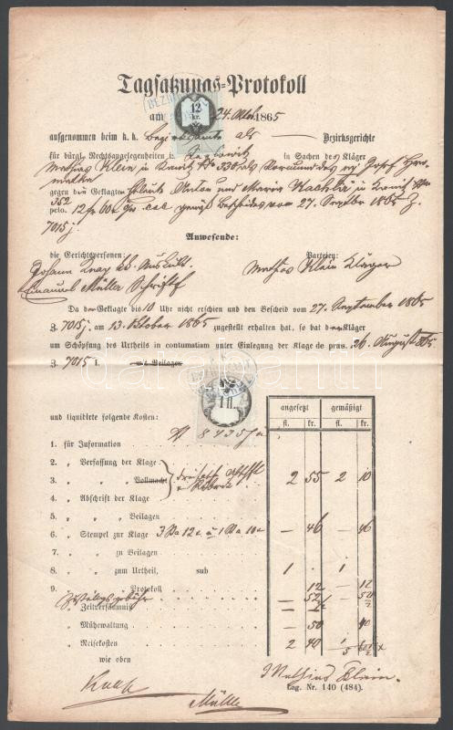 Leírás: 1865 Becslési jegyzőkönyv 1 Fl és 12 kr illetékbélyegekkel