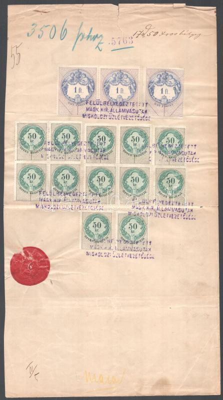 Leírás: 1891 es okmánybélyegek okmány részleten 3x1Ft + 12 x 50f