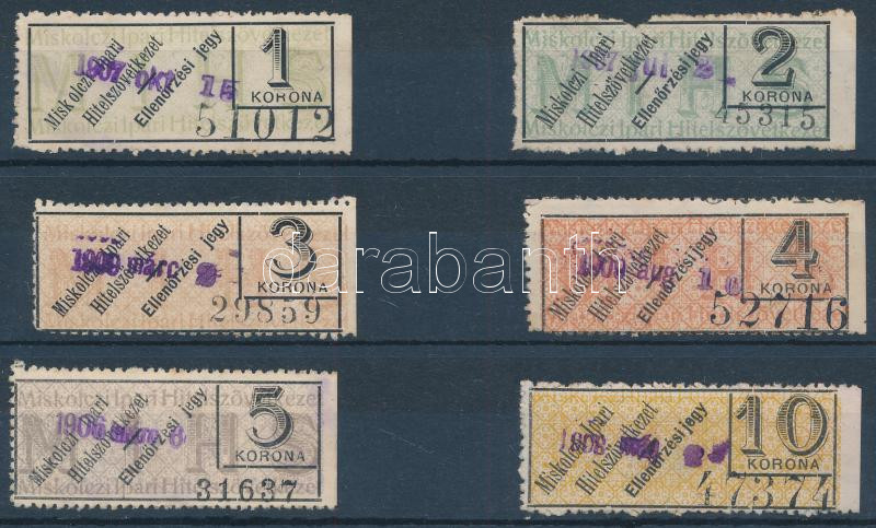 Leírás: 1906 Miskolci Ipari Hitelszövetkezet ellenőrzési jegy 6 érték