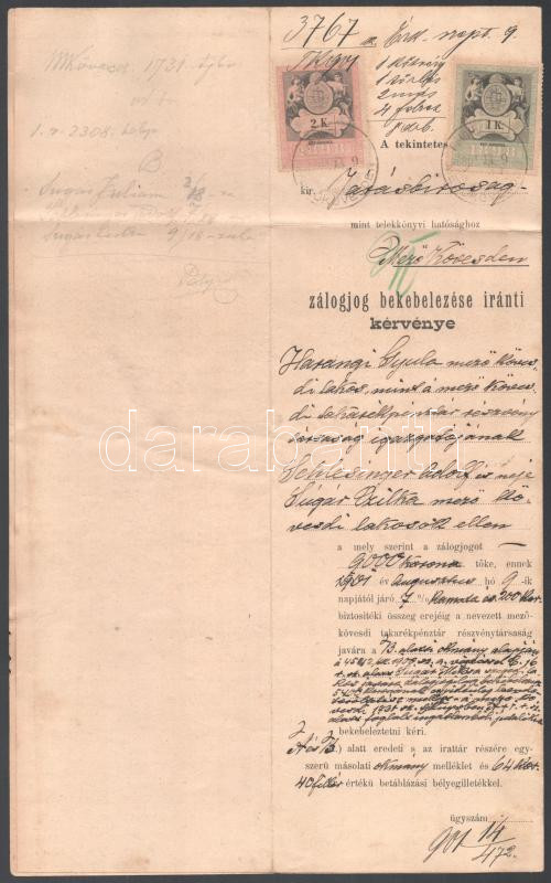 Leírás: Okmány 1898-as okmánybélyeg sor nagy címletű bélyegeivel, összesen 67,4 K lerovással.