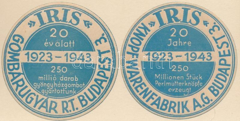 Leírás: 1943 IRIS Gombárugyár magyar és német nyelvű levélzáró