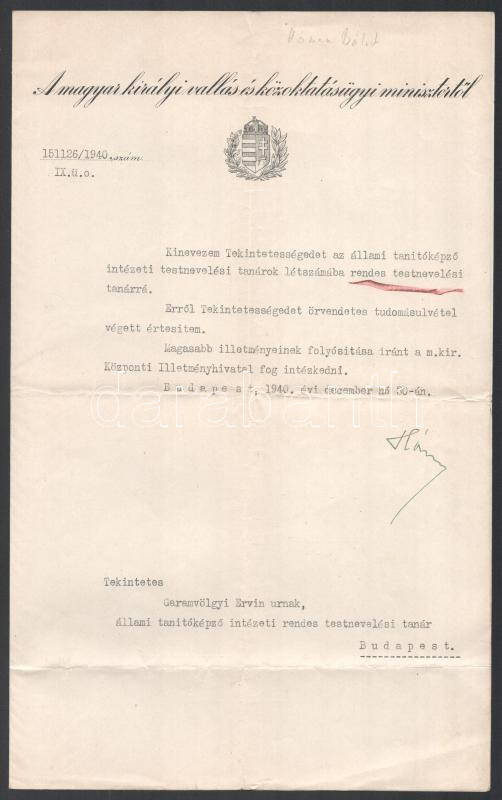 Leírás: 1943 Bp., Hóman Bálint (1885-1951) kultuszminiszter autográf aláírásával ellátott kinevezési okirat testnevelési tanárnak