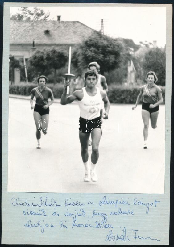 1972 Donáth Ferenc (1954) tornász, edző a Magyarországon áthaladó olimpiai lánggal a Műncheni olimpiára. futva. Nagykőrös és Cegléd között autográf dedikációval 16x24 cm