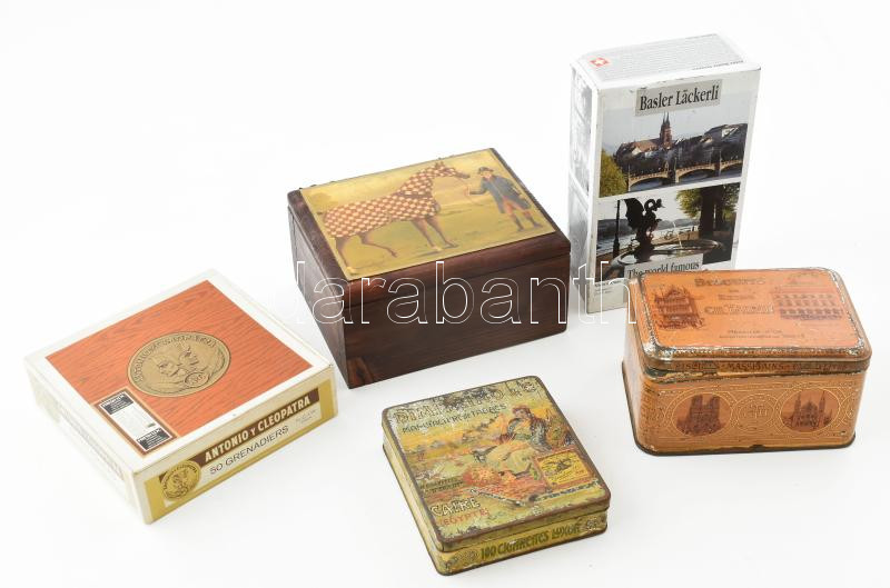 Leírás: 5 db szivaros és kekszes fém doboz, közötte fa ládika 17x19 cm