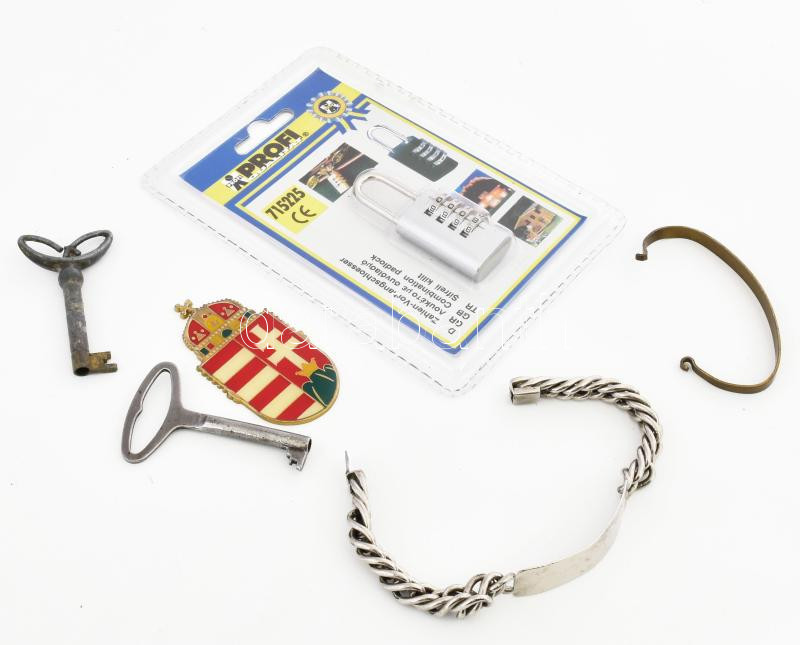 Leírás: 6 darabos bolhapiac tétel: kulcs, réz címer, számzáras lakat, karperec