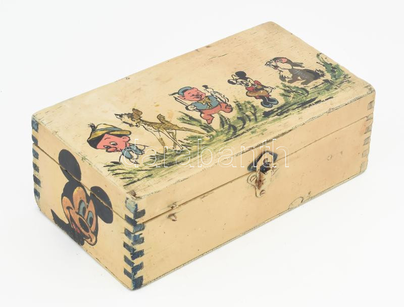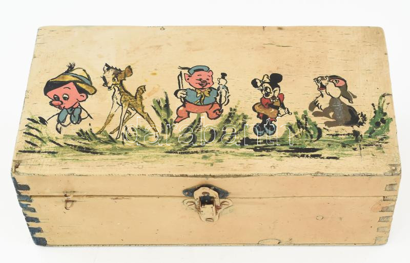 Leírás: Antik mesefigurákkal festett fa doboz, kopással, 30x16x10 cm