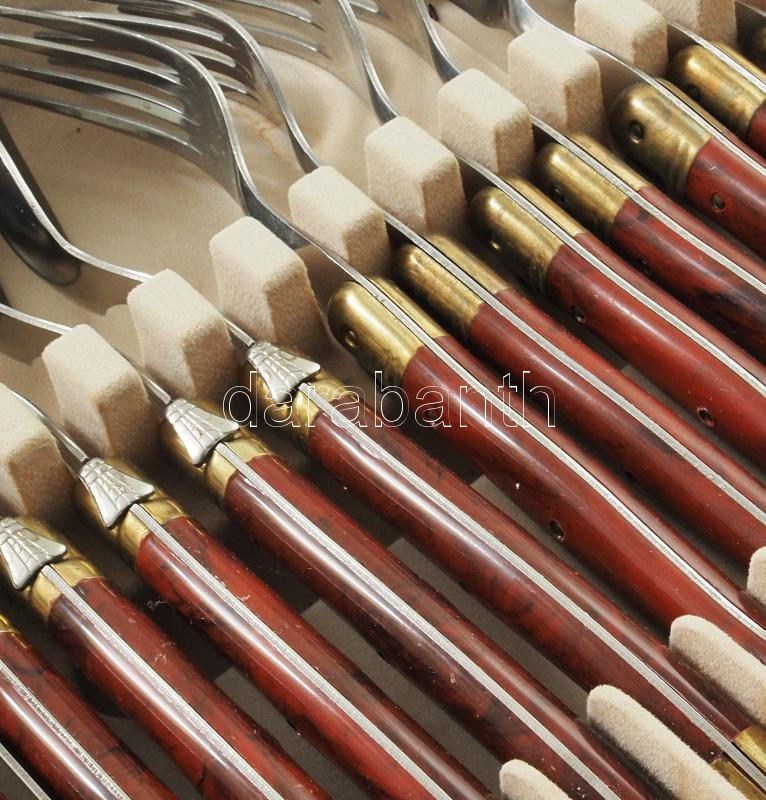 Leírás: Francia Laguiole evőeszköz készlet 4x6 db műanyag nyéllel, dobozában, újszerű állapotban