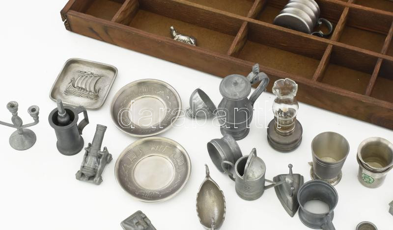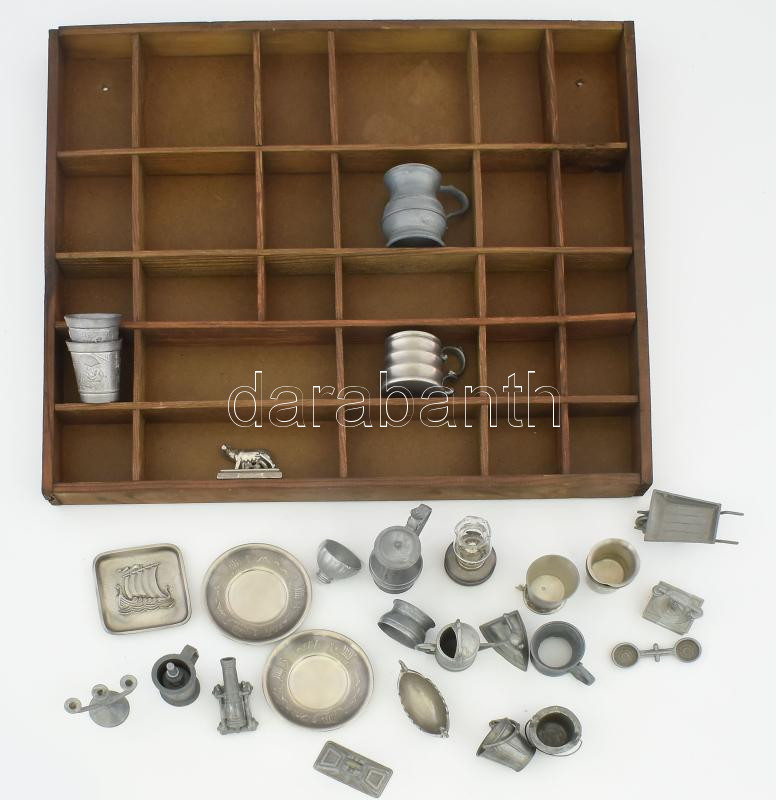 Leírás: Mini ón tárgy gyűjtemény 28 rekeszes tartó polccal. pohárkák, tálkák, hajó, szobrok, használati tárgyak kicsinyített másai a polcokon 50x50 cm