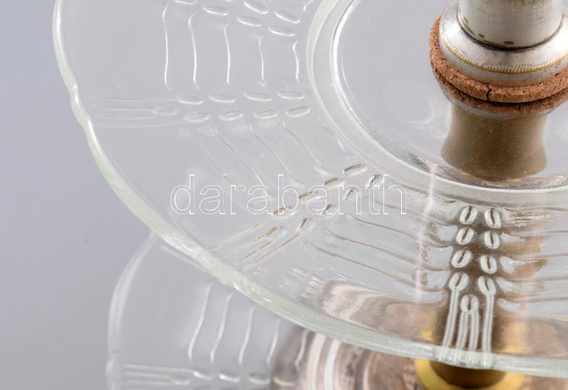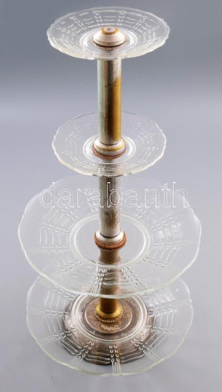 Leírás: Négyemeletes sütemény kínáló, ezüstözött réz szerelékkel, kopott, kissé ferde, m: 53 cm