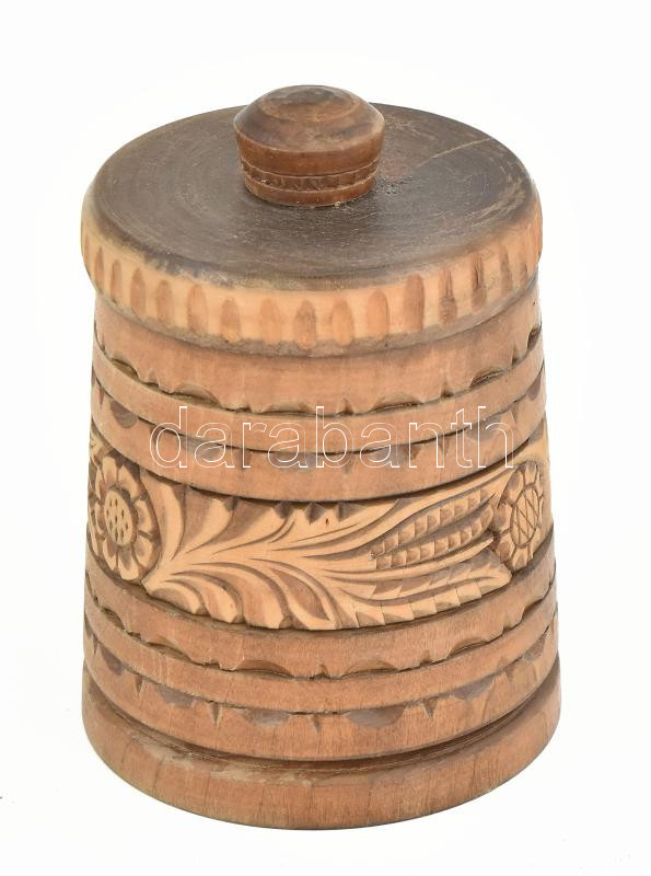 Leírás: Orosz faragott fa tárolóedény, m: 13 cm