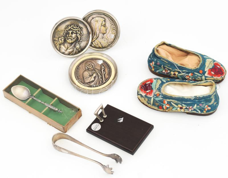Leírás: Vegyes tétel: 4 db fém és ezüstözött fém asztali szentkép, szőtt bőrtalpú cipő, cukorfogó, kanál