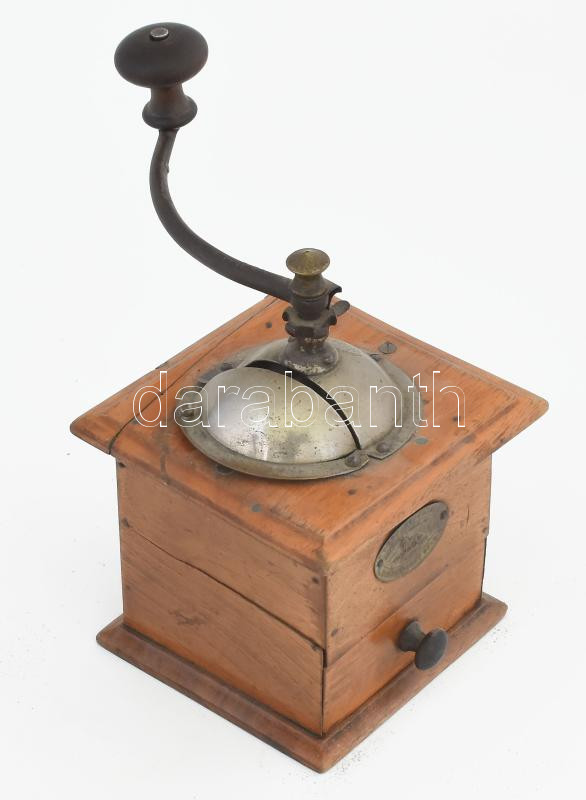 Leírás: cca 1900 Peugeot Fréres Valentigney kávédaráló, faházas, jelzett, fémcímkével is jelzett, m: 20 cm