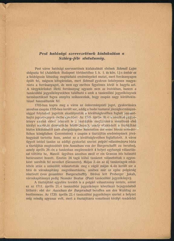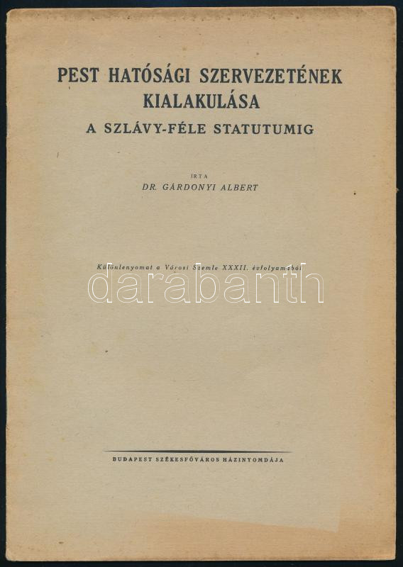 Gárdonyi Albert: Pest hatósági szervezetének kialakulása a Szlávy-féle statutumig. [Bp., 1942., Budapest Székesfőváros Házinyomdája], 14 p. Különlenyomat. Kiadói papírkötés, kissé foltos borítóval.